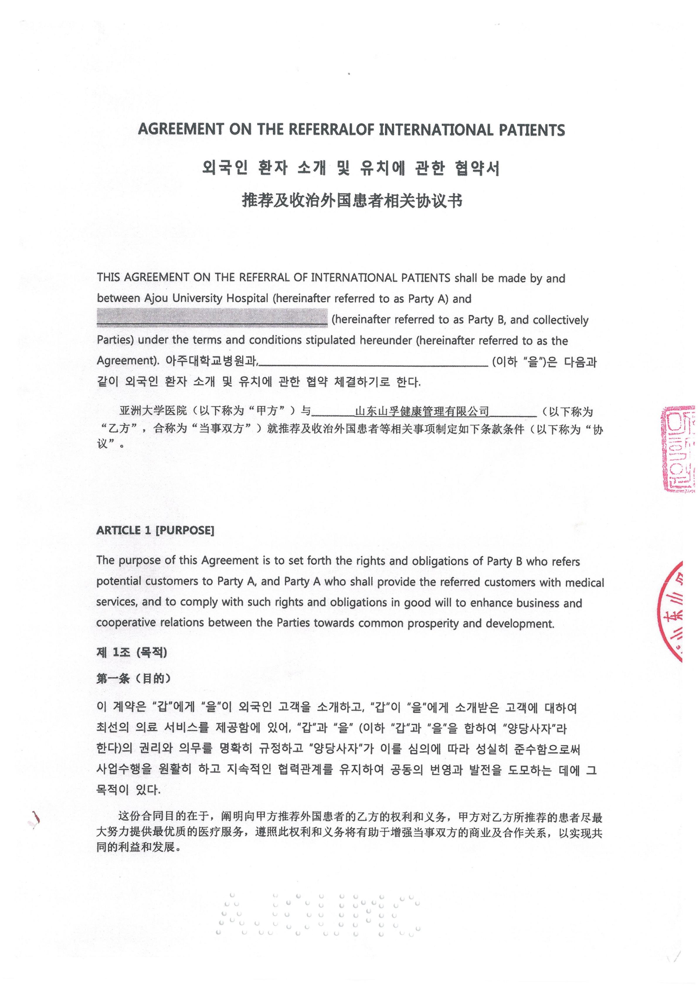 【概要描述】經過公司的嚴格審核,決定與韓國亞洲醫(yī)院建立合作(zuò)關系。